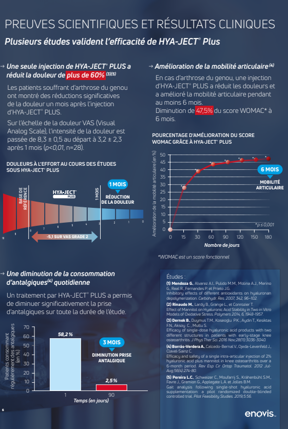 Ce traitement innovant se distingue par son protocole simple : une seule injection intra-articulaire suffit pour apporter un effet durable, généralement jusqu’à six mois. Grâce à sa composition stabilisée, HYA-JECT® Plus protège l’acide hyaluronique de la dégradation oxydative et prolonge son efficacité clinique.